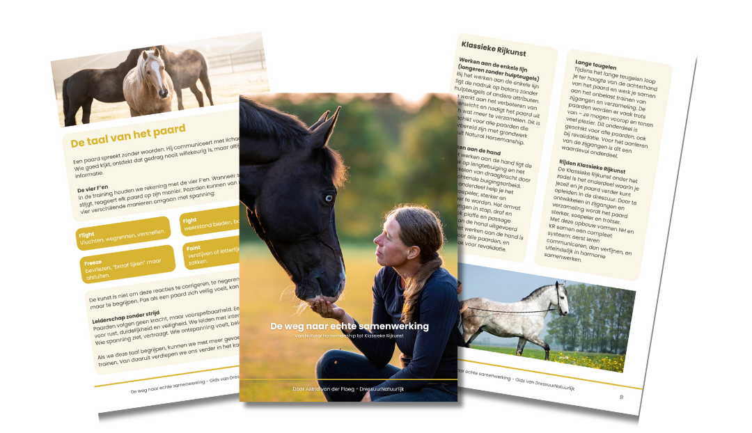 In deze gids ontdek je hoe Natural Horsemanship en Klassieke Rijkunst samen één logisch trainingspad vormen; van ontspanning en duidelijke communicatie naar balans, rechtrichten en lichtheid.